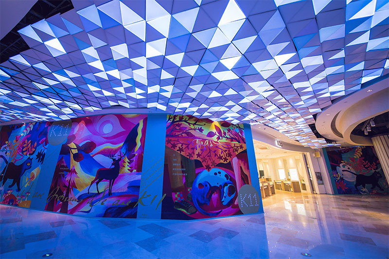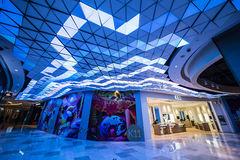 整個(gè)藝術(shù)作品是由1,500 塊等大的三角形燈片構(gòu)成,每個(gè)燈片的傾斜角度及離地高度不同,3 米寬、31 米長如海浪般的曲線造型懸掛在天花板上。流動(dòng)的波浪中安裝著可以變換1,680 萬種顏色和圖案的LED 燈光設(shè)備,所有顏色的變化與效果可通過計(jì)算機(jī)程序控制,通過改變每一個(gè)燈片的顏色組成各種形態(tài)。
