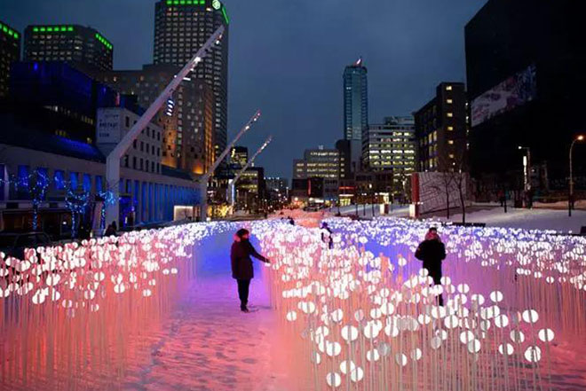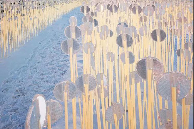 該項目的設計是從魁北克的麥田里得到靈感的,當小麥迎著微風左右擺動時,景色尤其美麗。由麥田浮動而生的Entre les rangs裝置是由成千個靈活柔韌的莖管組成,管狀結構頂部附有一個白色的反光膜,這些反光膜利用周圍的景觀刺激可以不斷移動變換,充滿活力與動感。