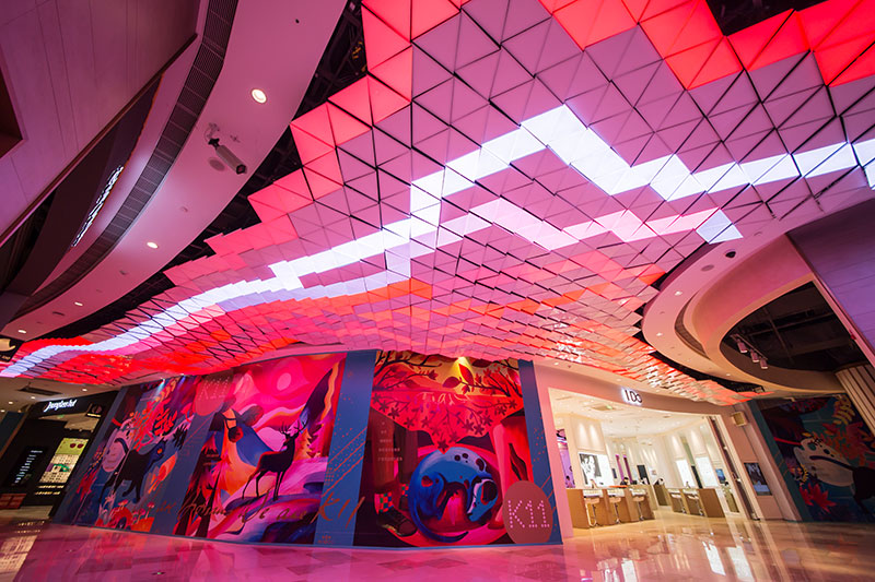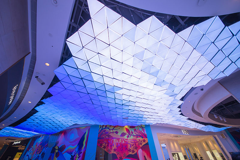 整個(gè)藝術(shù)作品是由1,500 塊等大的三角形燈片構(gòu)成,每個(gè)燈片的傾斜角度及離地高度不同,3 米寬、31 米長如海浪般的曲線造型懸掛在天花板上。流動(dòng)的波浪中安裝著可以變換1,680 萬種顏色和圖案的LED 燈光設(shè)備,所有顏色的變化與效果可通過計(jì)算機(jī)程序控制,通過改變每一個(gè)燈片的顏色組成各種形態(tài)。