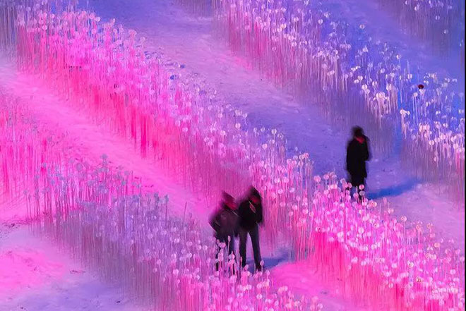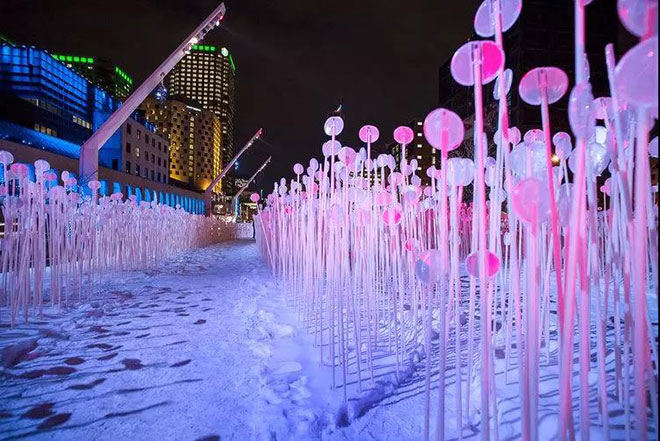 該項目的設計是從魁北克的麥田里得到靈感的,當小麥迎著微風左右擺動時,景色尤其美麗。由麥田浮動而生的Entre les rangs裝置是由成千個靈活柔韌的莖管組成,管狀結構頂部附有一個白色的反光膜,這些反光膜利用周圍的景觀刺激可以不斷移動變換,充滿活力與動感。